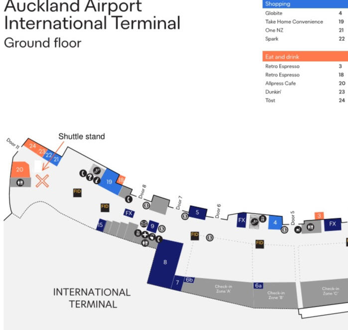 Your driver will meet you at the Shuttle stand, marked X, as showen on the ground floor map. It is near the Airports One nz Vodafone store. Your driver will be holding a sign with your name on it. There is a five minute walk from the Shuttle stand to the Off site transfer zone, as showen in the Carpark map. Your driver will assist you to the parked Shuttle. If you have special requirements, your driver can make arrangements to accommodate your needs. Maps of the Airport can also be provided by Auckland Airport help desk free of charge. https://www.aucklandairport.co.nz/information/airport-maps