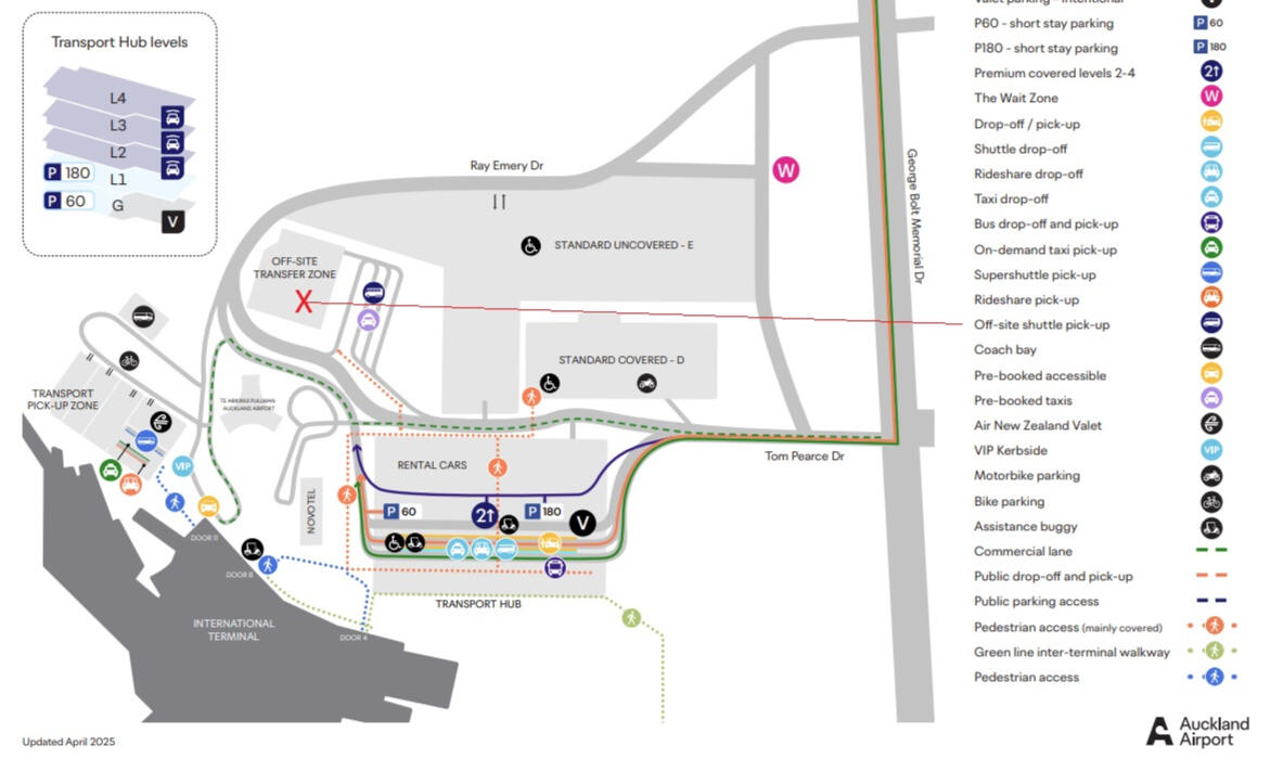 Your driver will meet you at the Shuttle stand, marked X, as showen on the ground floor map. It is near the Airports One nz Vodafone store. Your driver will be holding a sign with your name on it. There is a five minute walk from the Shuttle stand to the Off site transfer zone, as showen in the Carpark map. Your driver will assist you to the parked Shuttle. If you have special requirements, your driver can make arrangements to accommodate your needs. Maps of the Airport can also be provided by Auckland Airport help desk free of charge. https://www.aucklandairport.co.nz/information/airport-maps